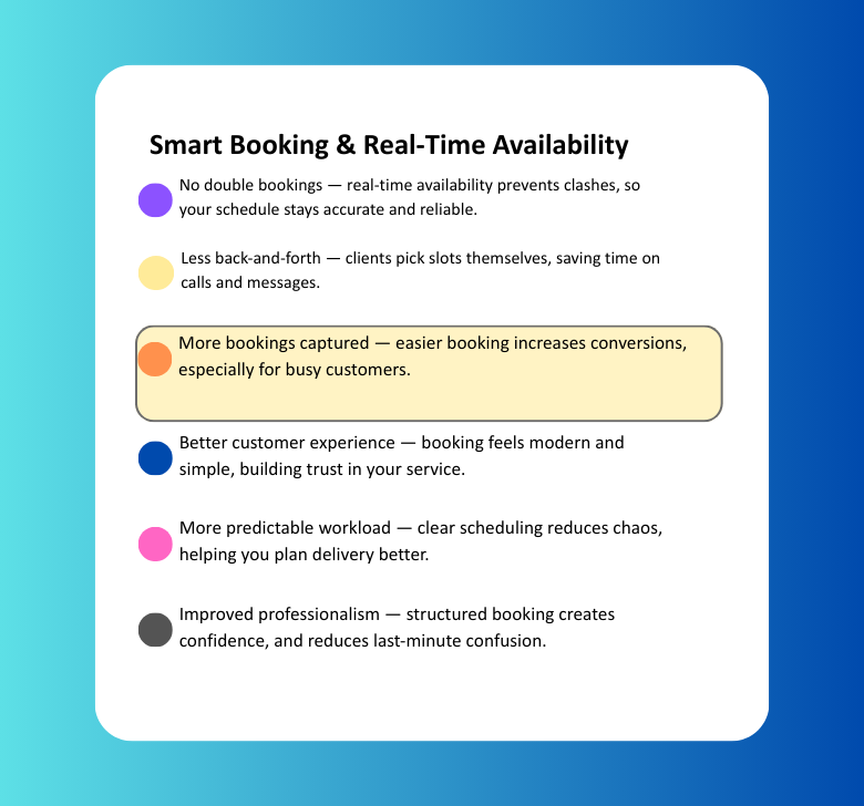Clients book based on your real availability so scheduling stays clean and professional.