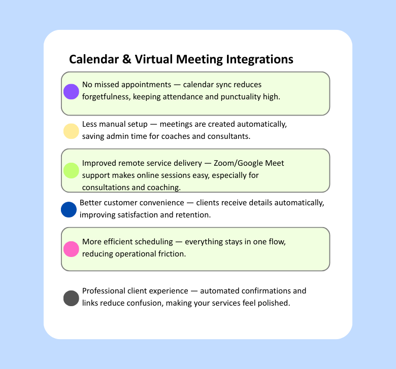 Sync bookings with calendars and create online meeting sessions so delivery becomes effortless.