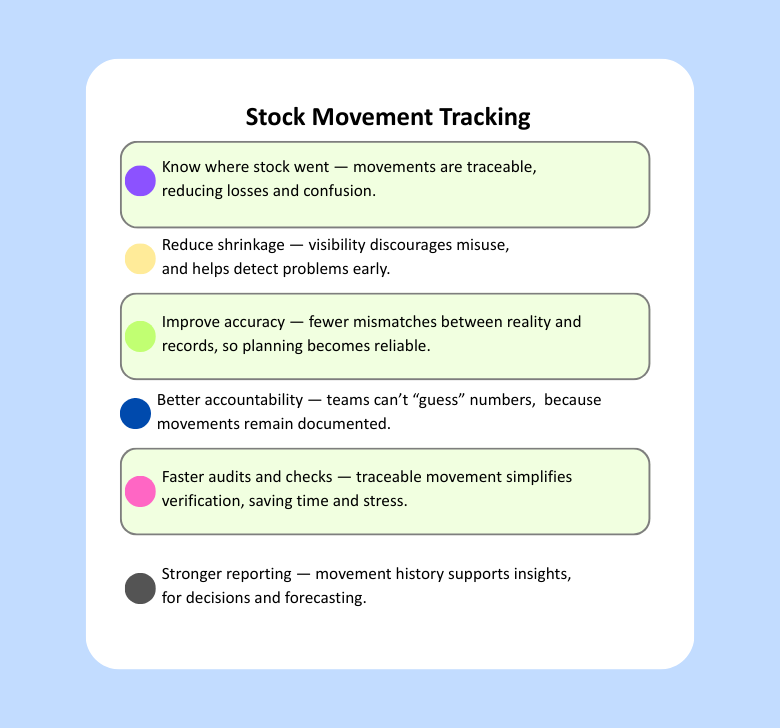 Track stock in, stock out, and adjustments so inventory stays accurate over time.