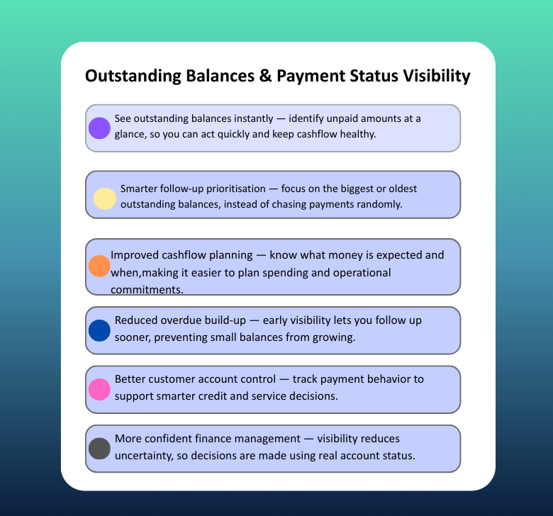 Track outstanding amounts per customer so you know who to follow up with and what to prioritise.