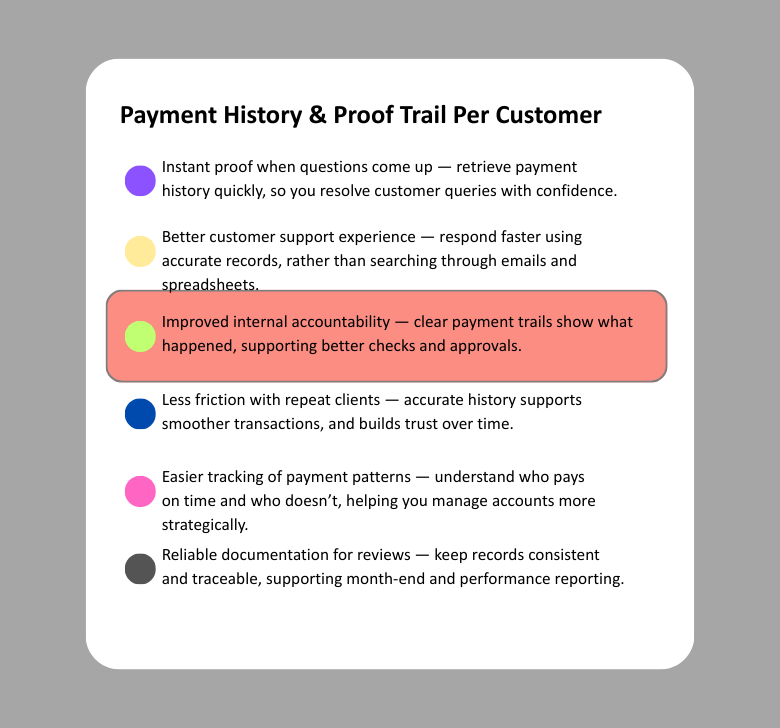 Maintain a clean payment trail for each customer so verification, support, and reviews become easy.