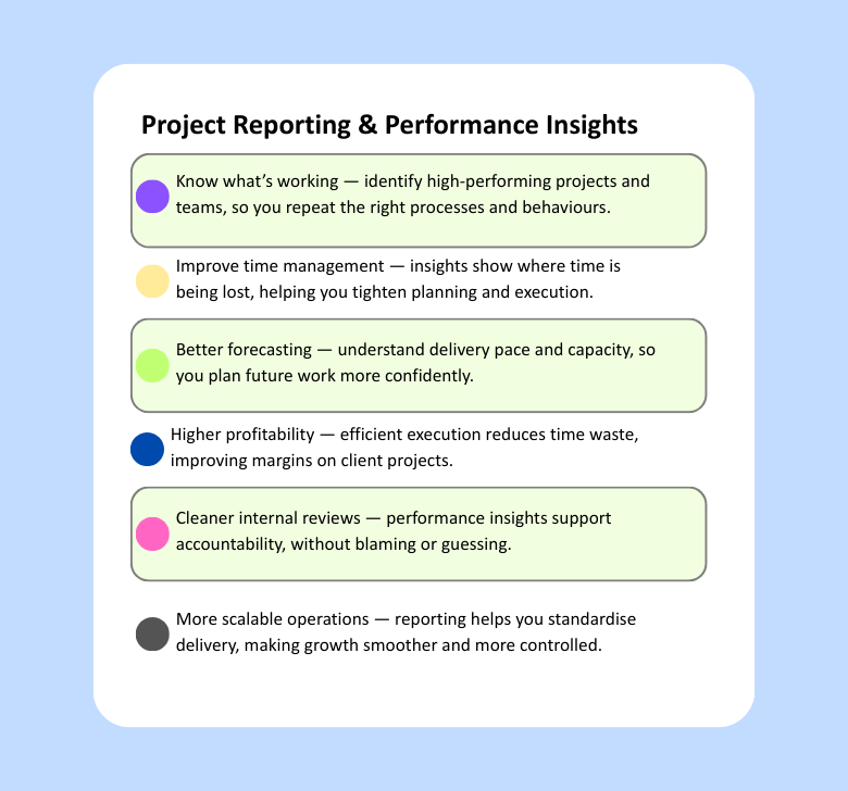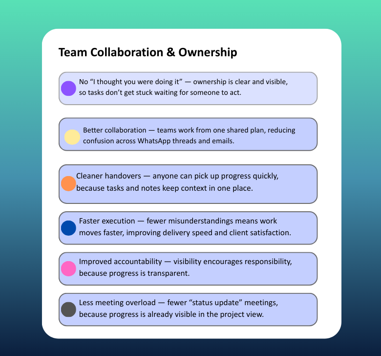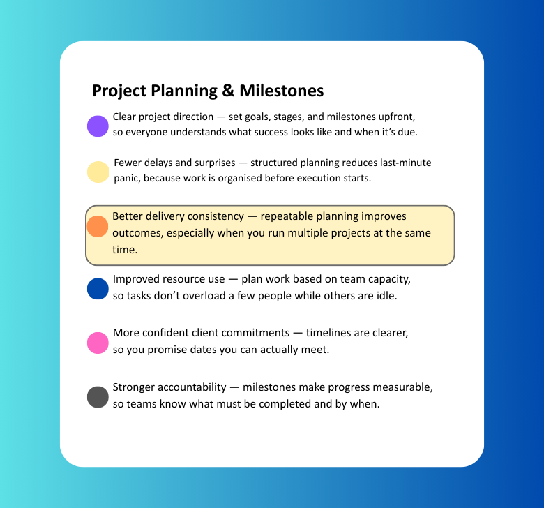Plan, deliver, and track every project in one place—so deadlines are met, teams stay aligned, and clients get consistent delivery.
