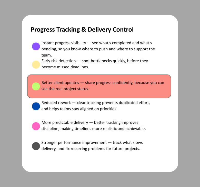 Track what’s done, what’s late, and what’s pending so you stay in control of delivery at all times.